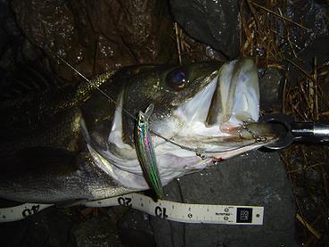 | 私自身ボーグを使い始めてもっともランカーサイズを獲るために非常に重要な機種。 まずはポイント別シュチュエーションとしては、ある程度水深があり適度な流れがある場所での使用が多い。 次にベイトに関しては20cm程度のボラ、コノシロが沸いている時はLBが最強!!LBの特徴である大きなウォブリングが大き目のベイトを捕食しているランカーサイズに一早くアピール。昨年もコノシロパターンにて95cmを頭に4本の80UP、70クラスも多数出しており、LBで釣れるのは比較的良いサイズが多いのも特徴であろう。 またデイゲームでの反応も良く、夜のうちフィーディングポイントに入り込んだシーバスが昼になってもそのエリアの近くのストラクチャーに居ついているような時、こういう時にもLBが有効。 ある程度潜行レンジが深いため目の前に送り込んでやることが出来カラー選択を間違えなければ一発で食ってくることが多い(その日の水色、光量によりカラー選択を変えていく)。 |