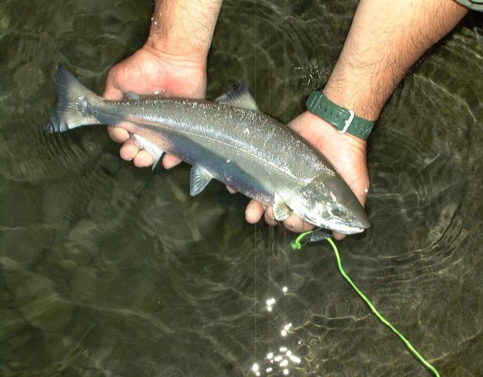 ヒット直後にグルングルンとマス特有の抵抗を見せましたがガッチリとクラッチフッキングしており難なくネットイン!(^-^)