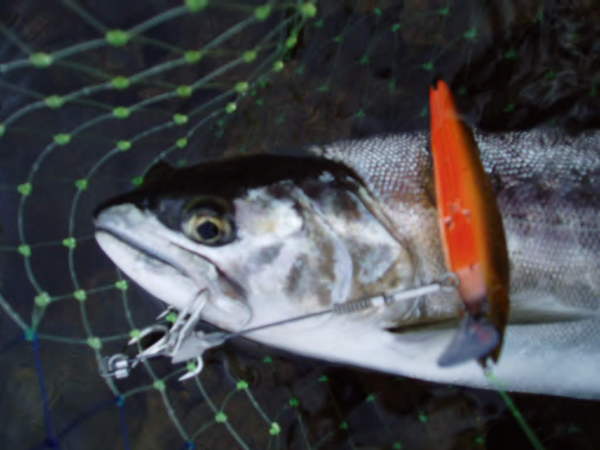割合簡単に浮いてきた、まあまあなサイズ、普通のミノーと同じように口にかかっている。