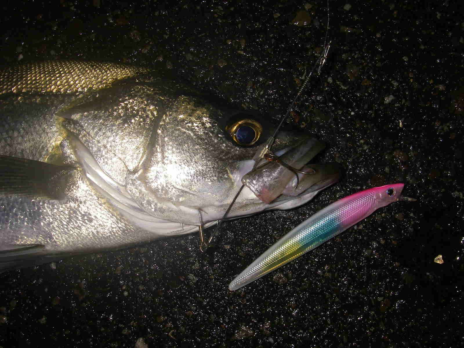 ショアー平鱸のJGFA世界記録保持者、井上友樹さんのパイロットカラー、コットンキャンディー(ホロ)をクリアーパールベースで塗装してもらったカラーでのヒット。