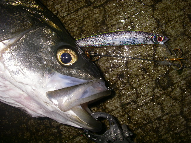沈みテトラの上をオスプレイ・シンペンで攻めていると、今年初めて自分にシーバスがヒット!