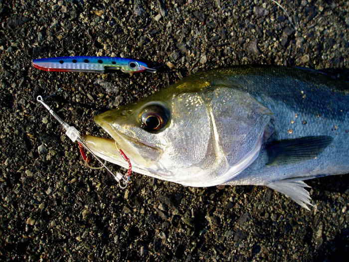 取りあえずは岸壁際にベイトリールのクラッチを切り、底までフリーフォール後、ショートピッチで巻き上げ、様子を見ますが時折水面近くまでシーバスがチェイスしてきますが、バイトに至らず、その後もフォール途中ジグに、二度小さなアタリが有りましたが、これもフッキング出来ず!苦戦しました。