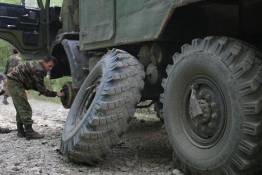 なんと、あまりの悪路に軍用車も悲鳴をあげ、