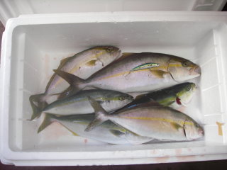 スカイパスナインを遠投していたオーナーの小型カンパチ一尾を除き1.45キロカンパチを筆頭にカラー担当者の本日の釣果。