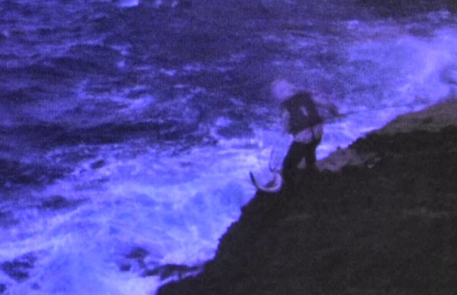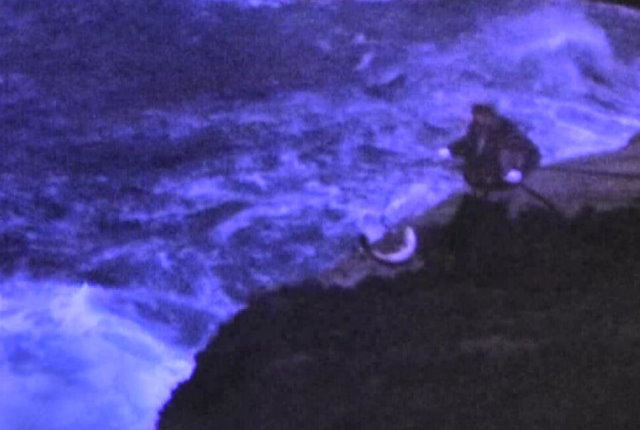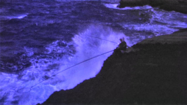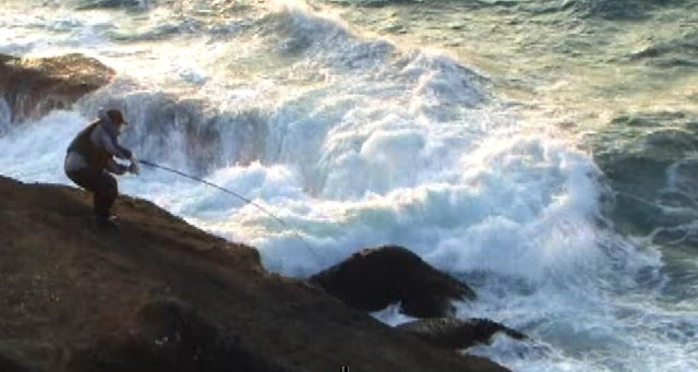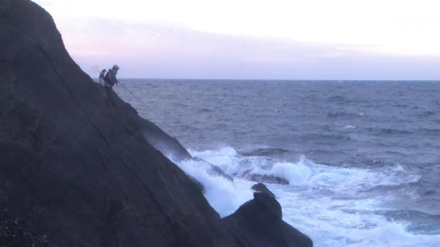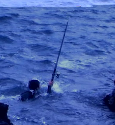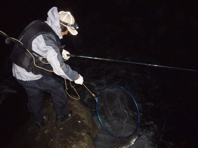 2008_10_29 スネーク・スタビライザーによる磯平ランディングの模様 確保後はリールのベイルを開いてロープを手繰る。このネットに収まったヒラは小型だったが10キロの獲物を入れても安全に取り込むことが可能だ。もし通常のタモであればネット確保しながらも枠の抜け落ちや柄折れによるバラシの危険に曝されることになる。高場でランカーを目指すならスネーク・スタビライザーは必携である。