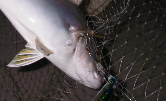 10月8日カンパチ1.1キロ ファルコン128シンキング・ペンシル ネットにより2次フッキングは解けたが2号フックでも完全バイト! 青物トライ成功、としよう。