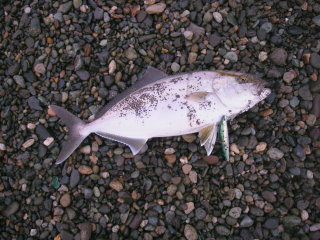 2008年11月10日壱岐の松尾さん おそらく壱岐初のデカメッキ64cm(ロウニンアジ)のランディングに成功!!
