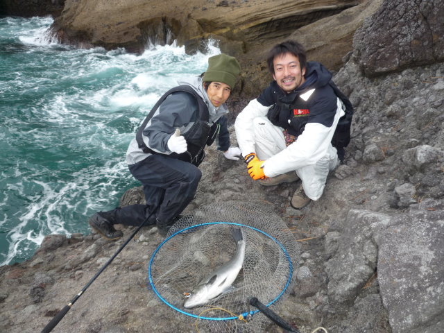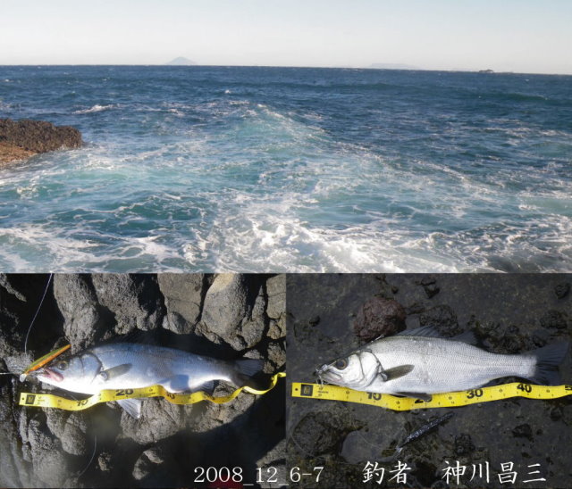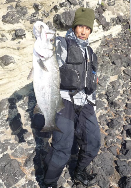 神川です。写真を添付しました。生では大きすぎたので小さく編集しています。風が強くて長さが分かりにくいですが、55cm、2kgでした。いっぱつで出ました。ポイントは写真の真ん中、でピックアップ寸前に出ました。なんと、すぐに2匹目がヒット、しかし、残念ながらラインブレイクです。しかし、さすが、黒金です。また、LBの必要性を実感しました。当日は風が強く、SBでは風で流されてしまいます。LBだとしっかりと泳いでくれました。その後、黒金SBもロストしてしまいました。帰りに土屋さん(河津ブルラン)のところでLBとSBを購入しました。あって良かった。(右の個体は初日の木村スペシャルによるラン)
