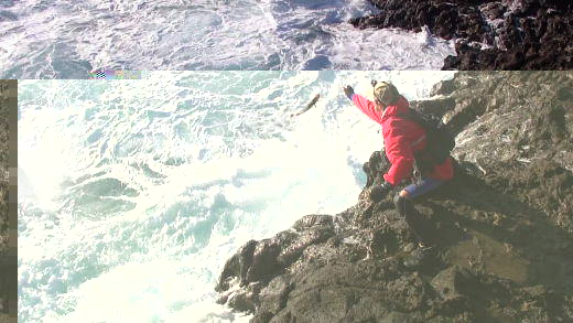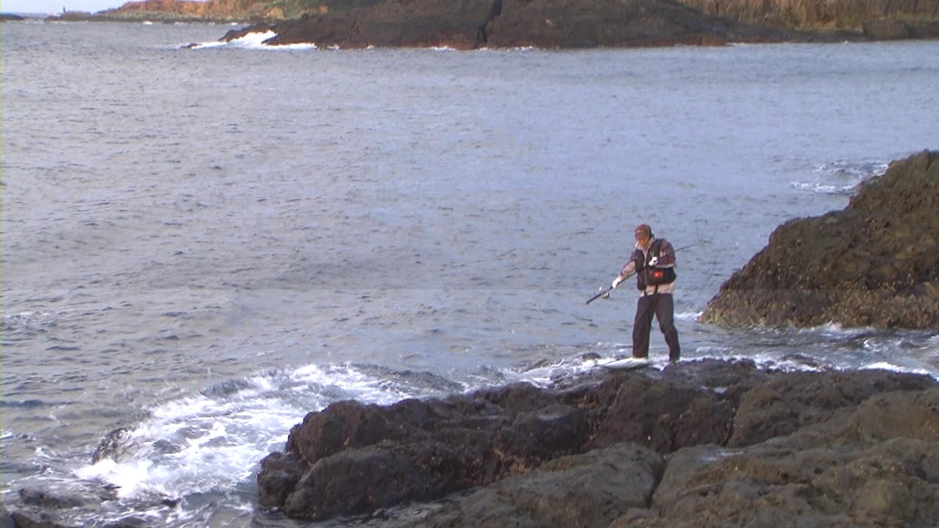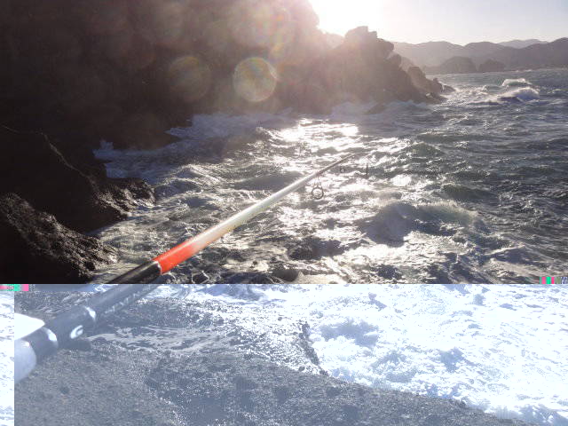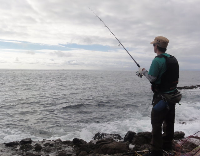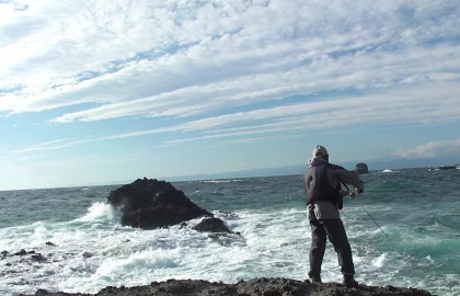 慶太さんのランディングは根向こうで乗せた完全クラッチヒット。大きな波を待って選び魚体を波に乗せ、岩越えさせて取り込んだもの。