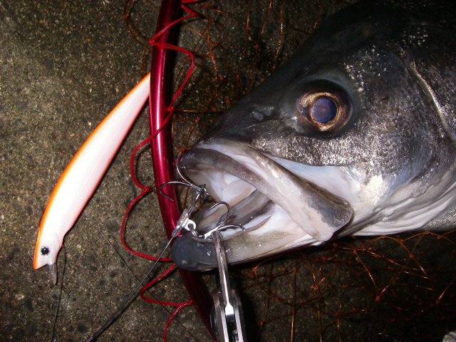 ハンターさん、シーバスタックル+ファルコン128 SB/Leadによる巨大魚ヒット。バットから伸されながらのやり取り。