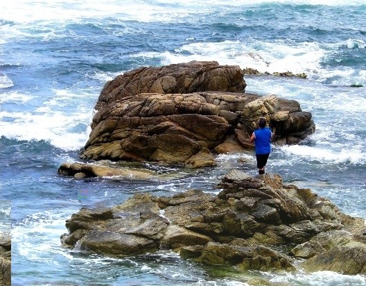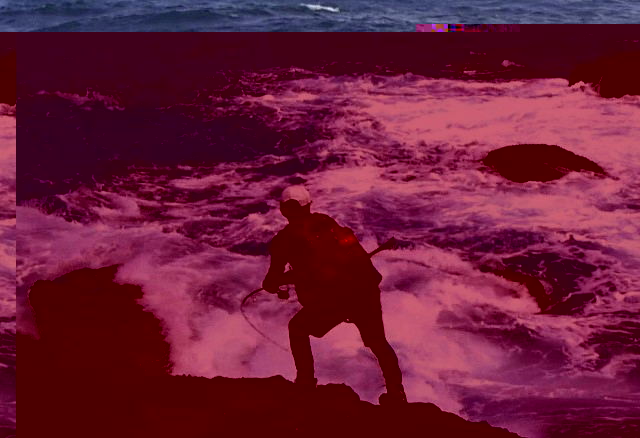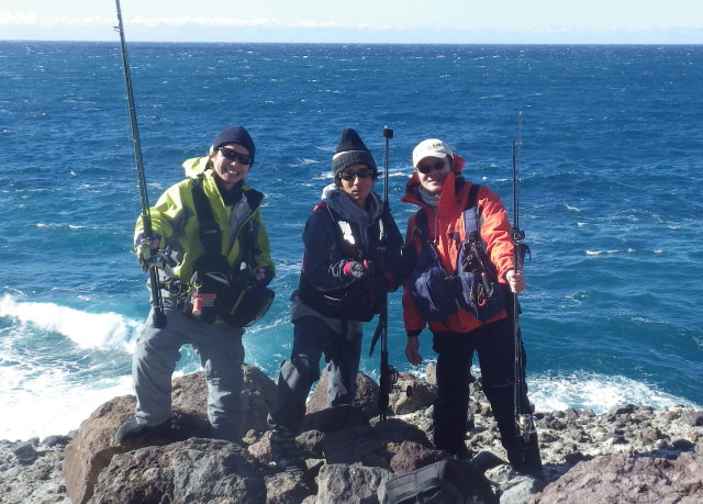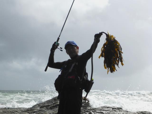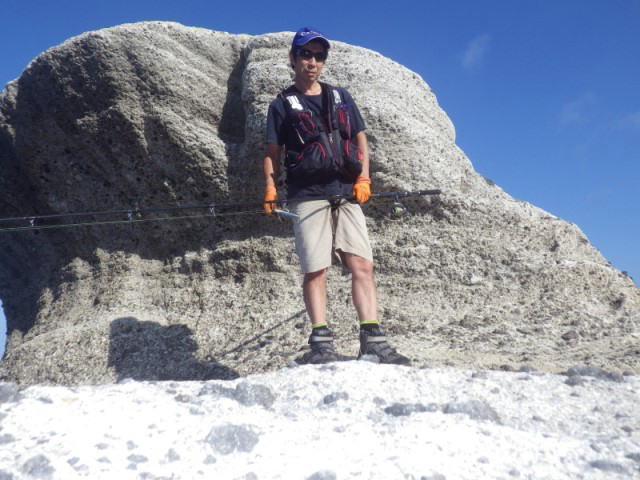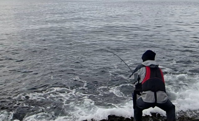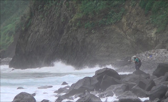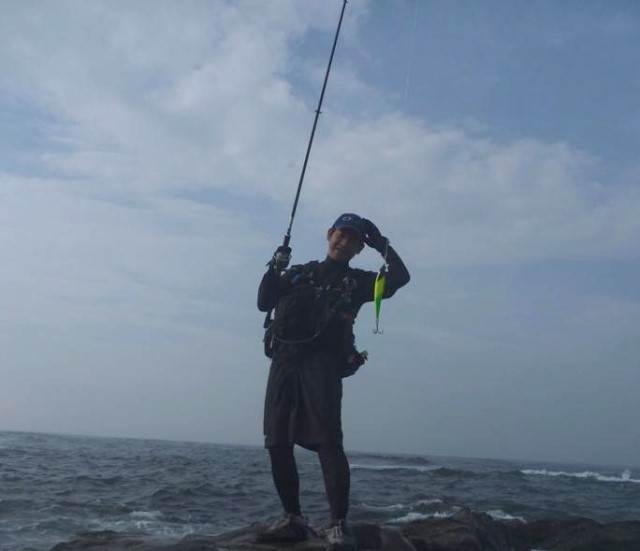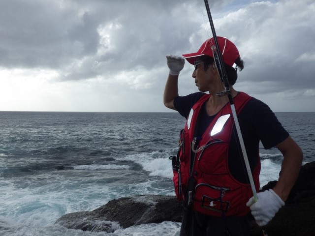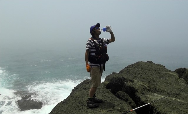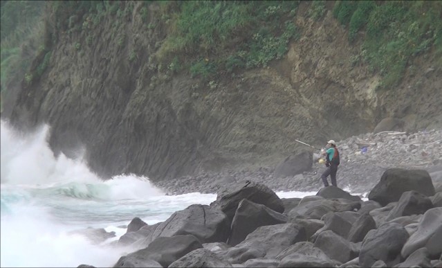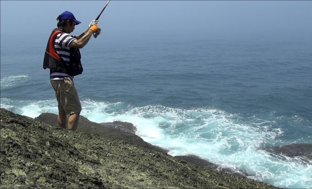 波が打ちつける滑りやすい複雑な岩礁帯の上でバランスを取り、長時間のキャスティングを続け