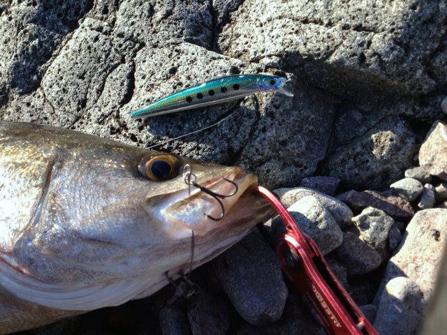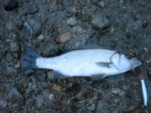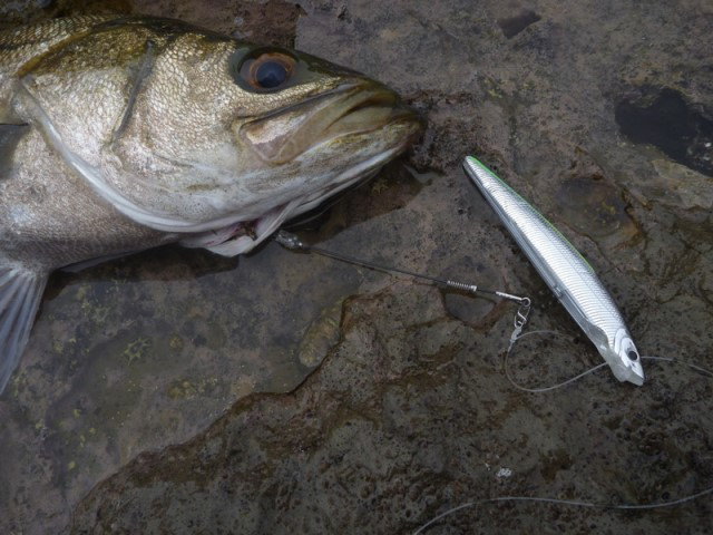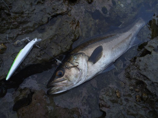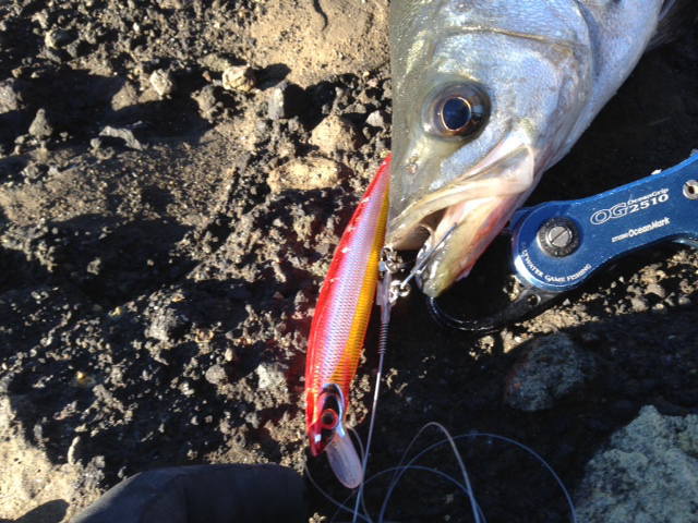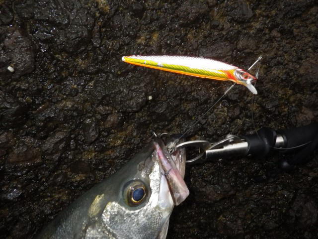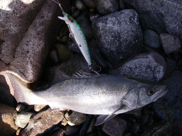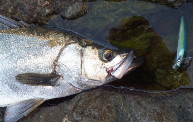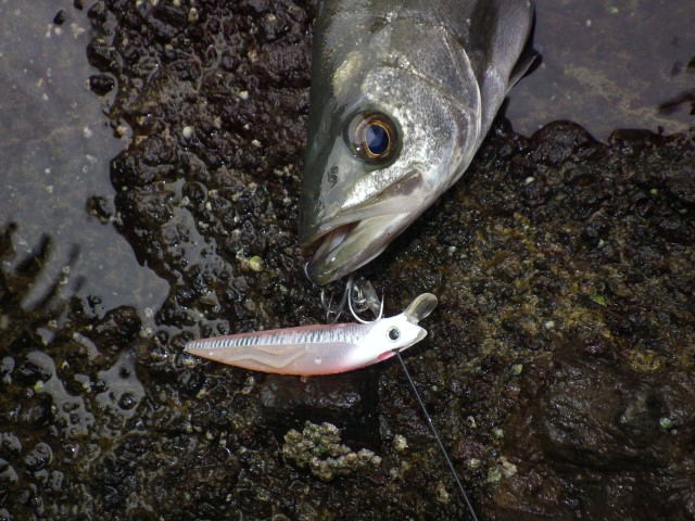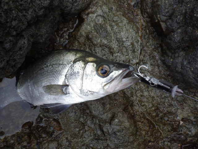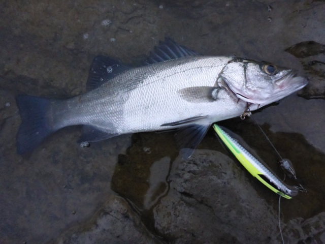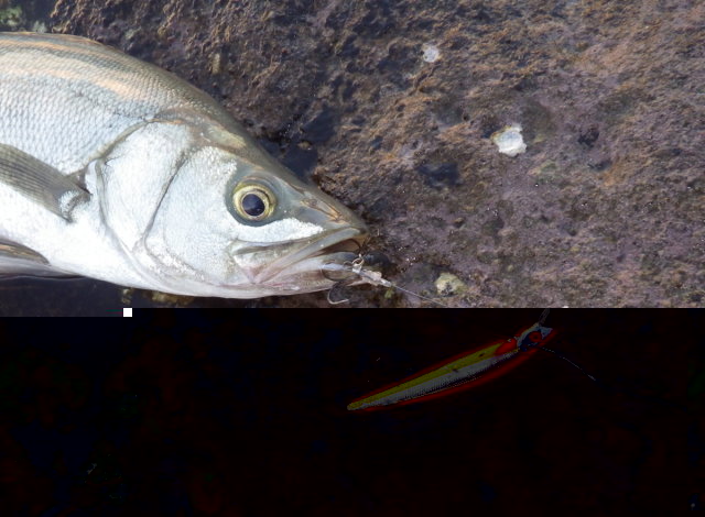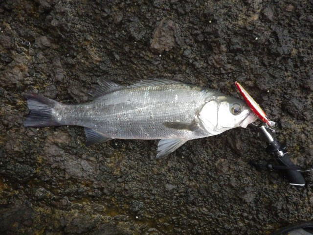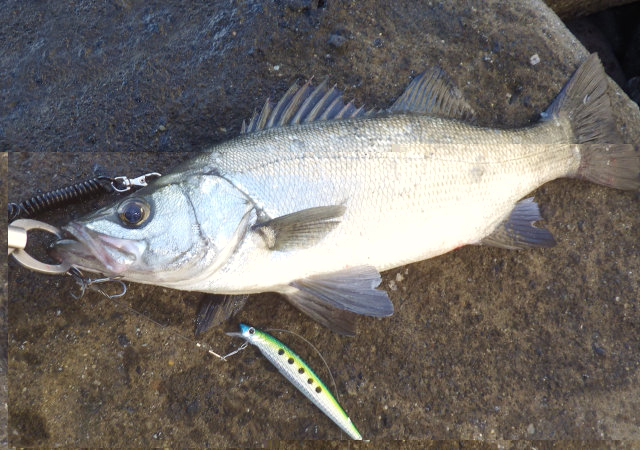 13時頃、メバルサイズのヒラスズキのヒットを皮切りに、2尾確保&リリース。