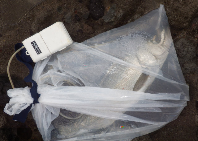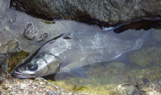 確保。 色が黒く、居着きのヒラスズキと思われる。(写真: 2.85Kg)