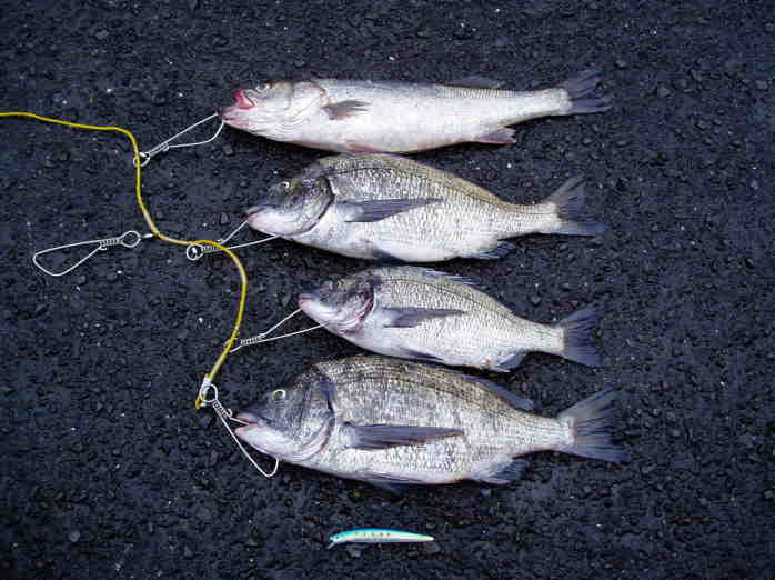 平鱸![]() 2尾の平鱸を1つのボーグルアーで釣りました 現認者 幡手寿紀さん |