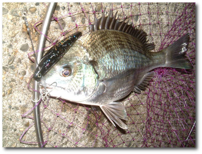 電灯に映し出された魚は,念願のクロダイ。40pを切ったが,狙ってとった実にうれしい1匹。(私が付けたちゃちなリップは完全に吹っ飛んでいました。苦笑。)