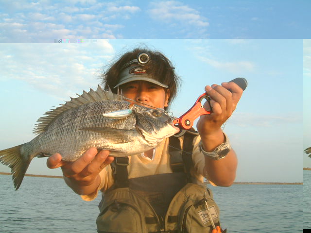 その後,ルアーに違和感を感じ合わせると,クロダイ独特の下に下に引く強い引き。
