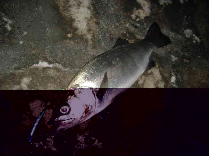 無事ランディングしたのは、ランカーには少し足りないサイズのヒラスズキ77cm!